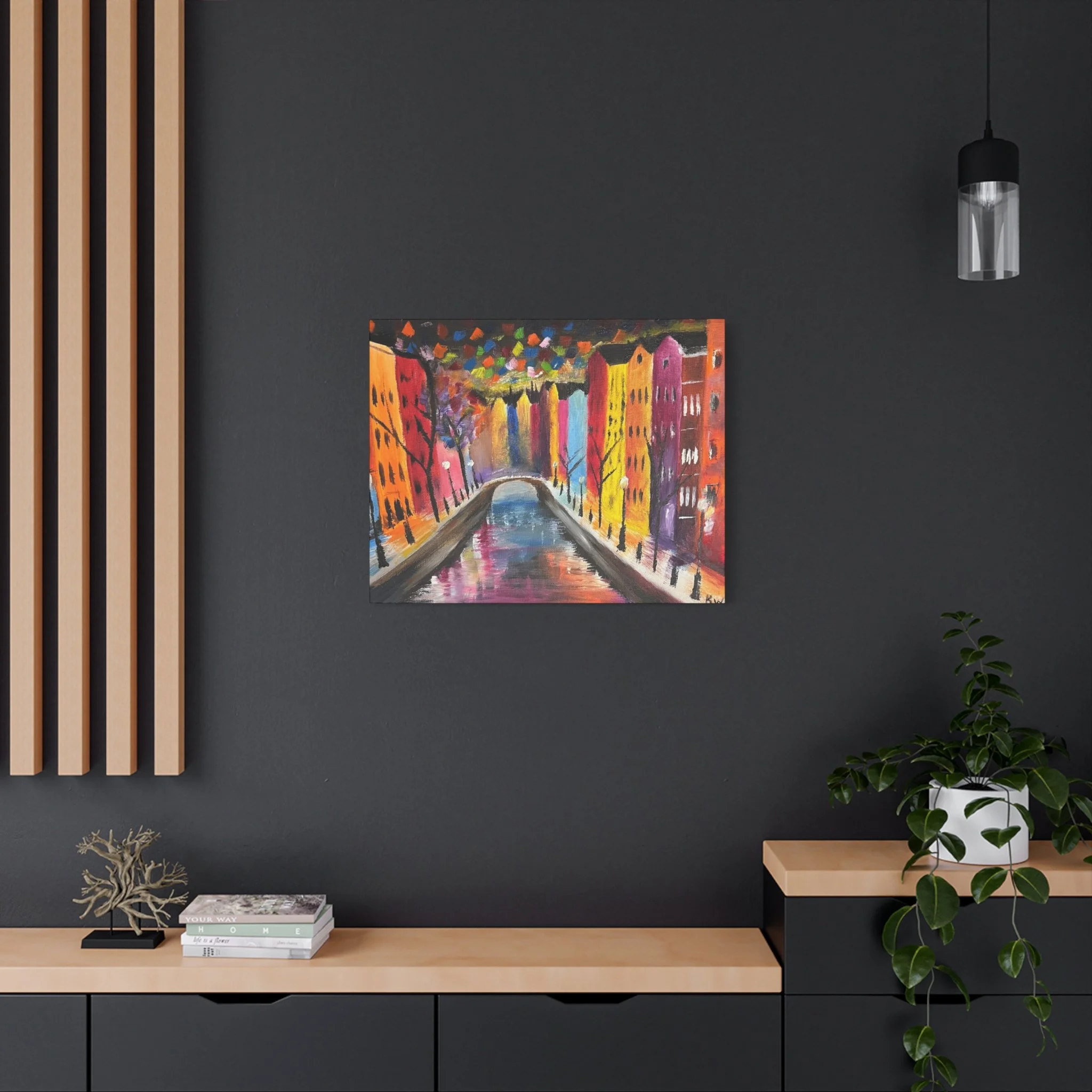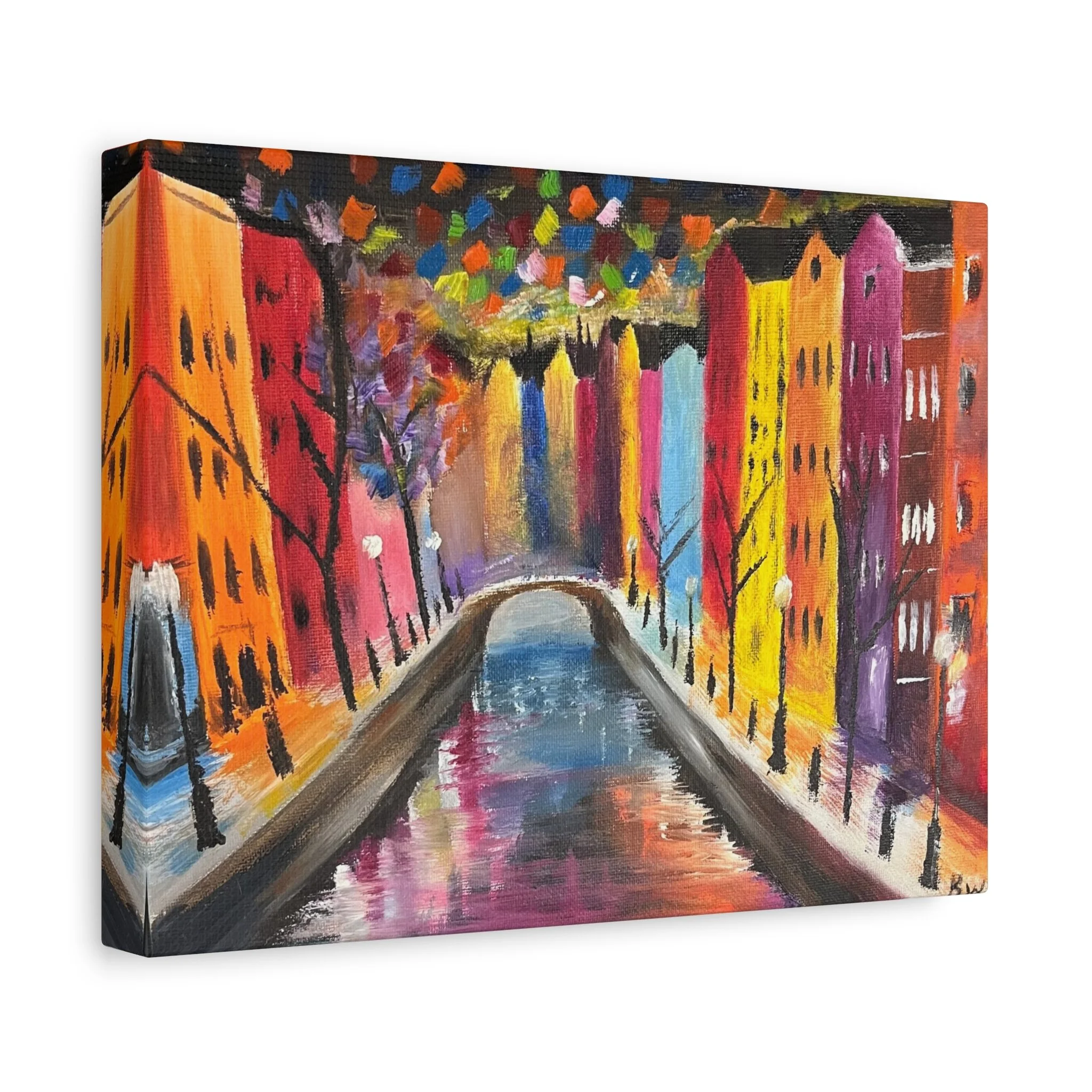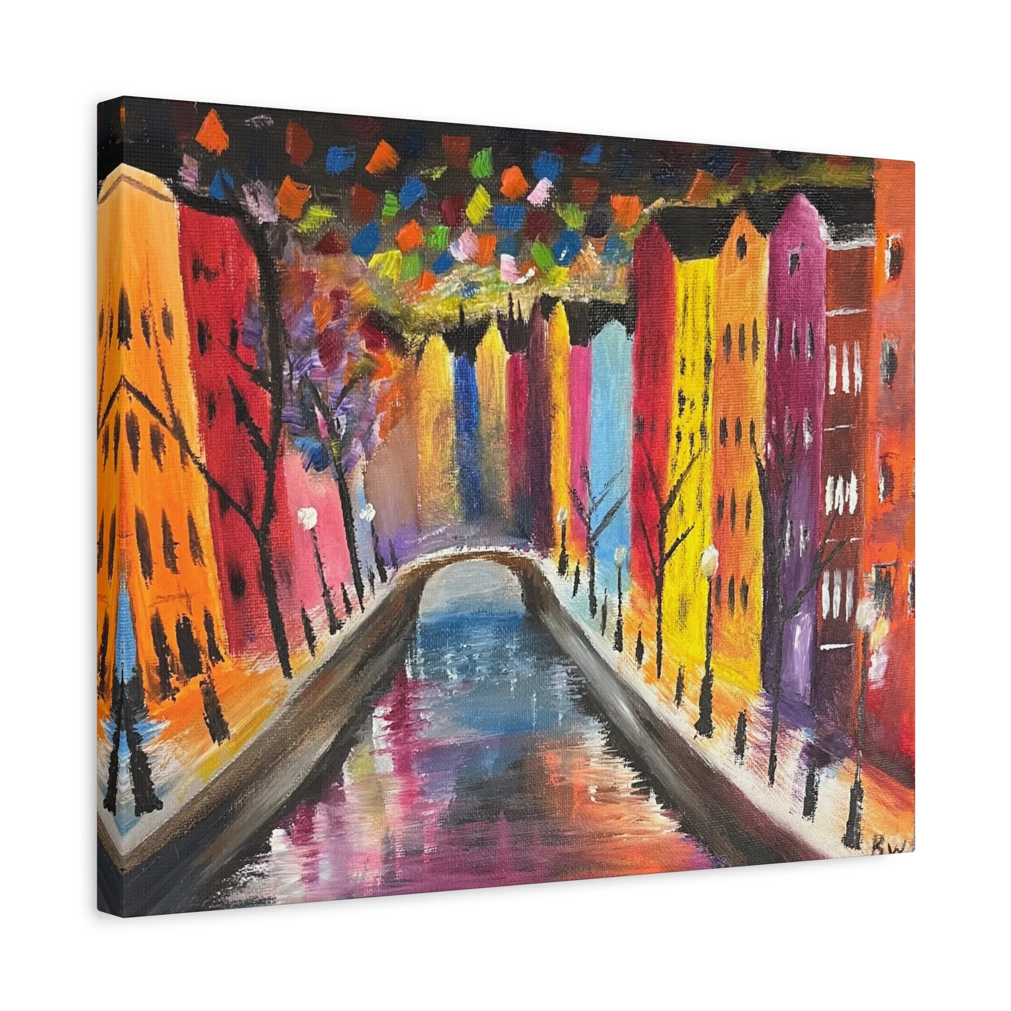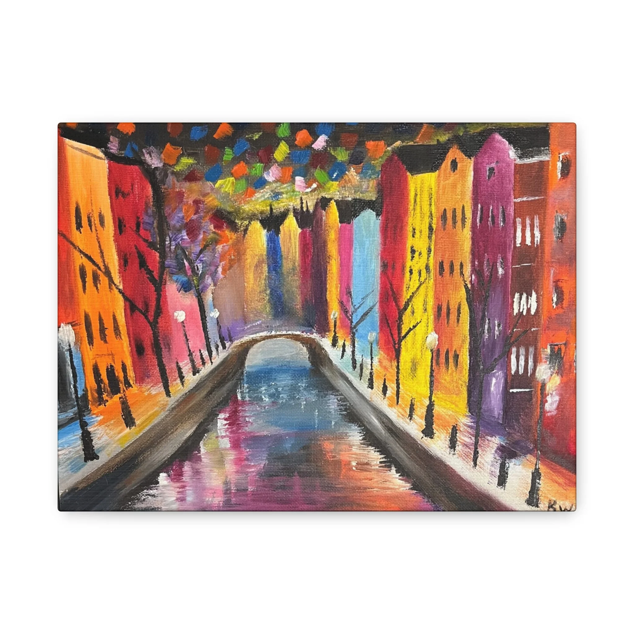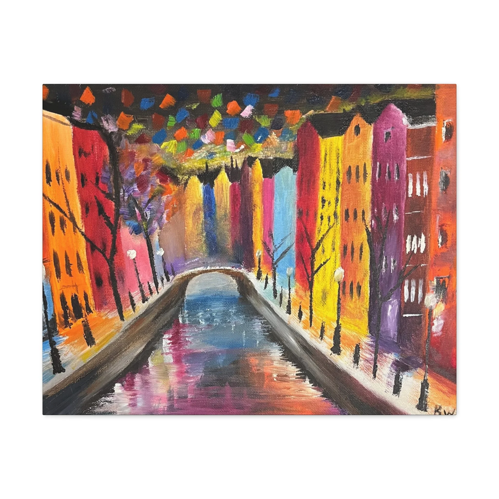 Abstract painting of a photo taken at Amsterdam. This painting brings out the bright lights of Amsterdam at night time. Each matte canvas comes with back hanging already included for convenient placement. The frame is made with profile radiata pine that is ethically sourced from renewable forests.