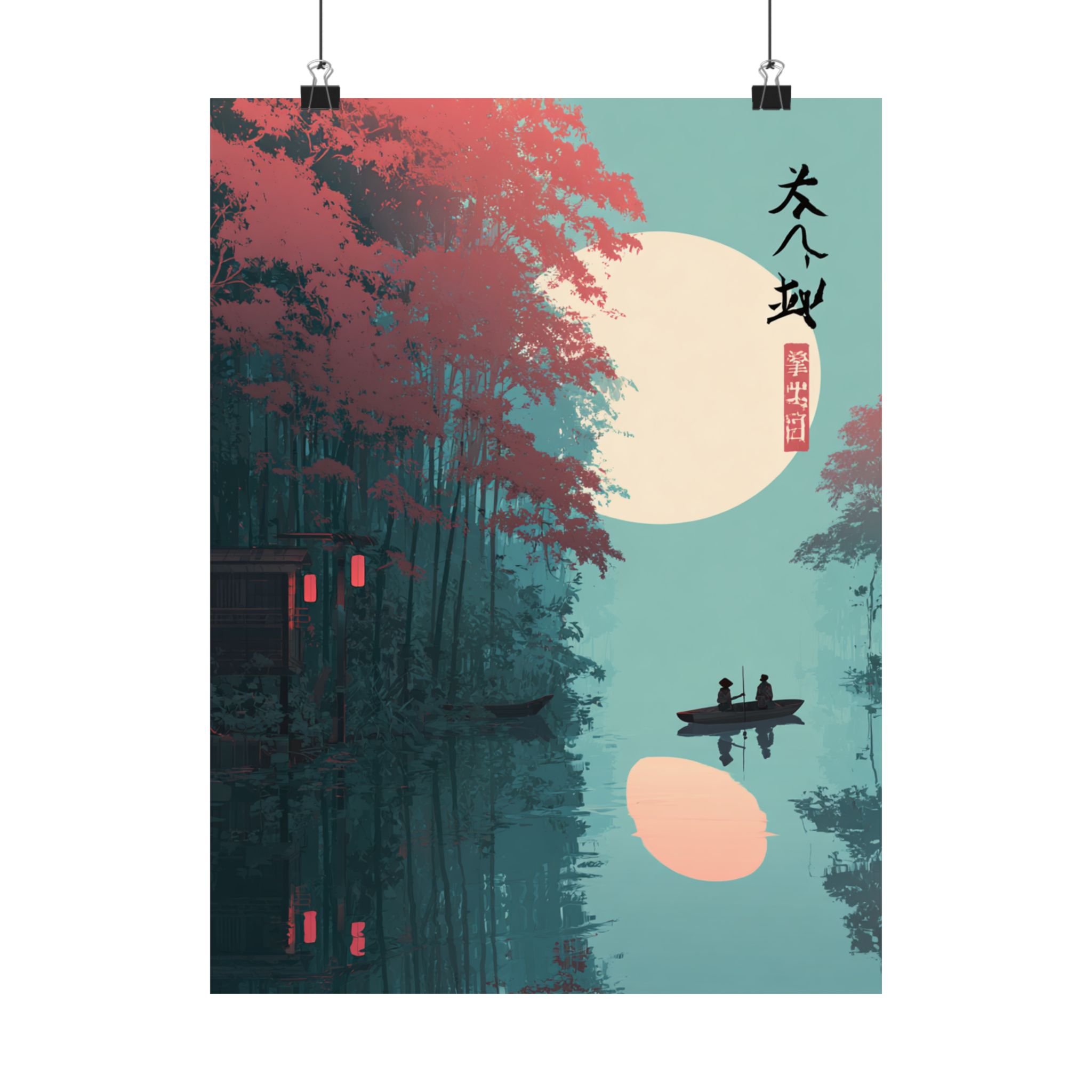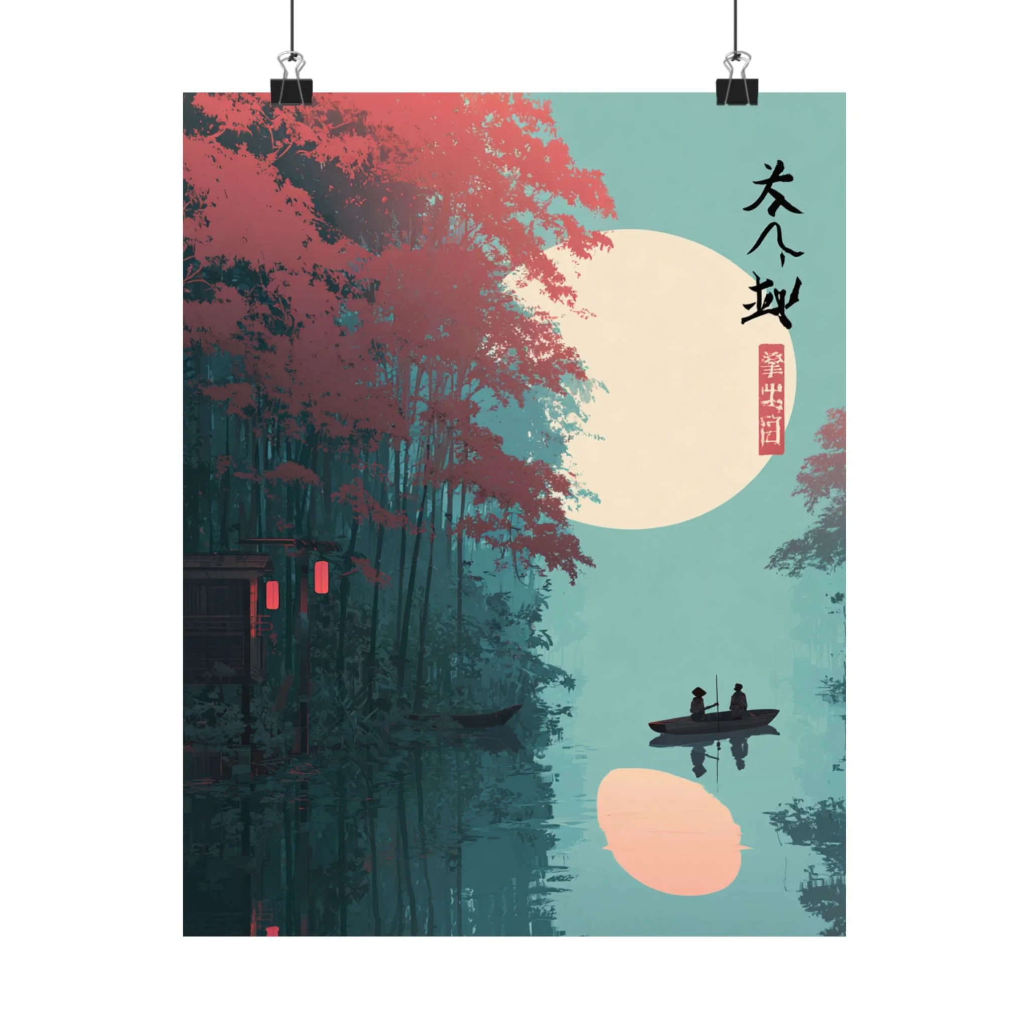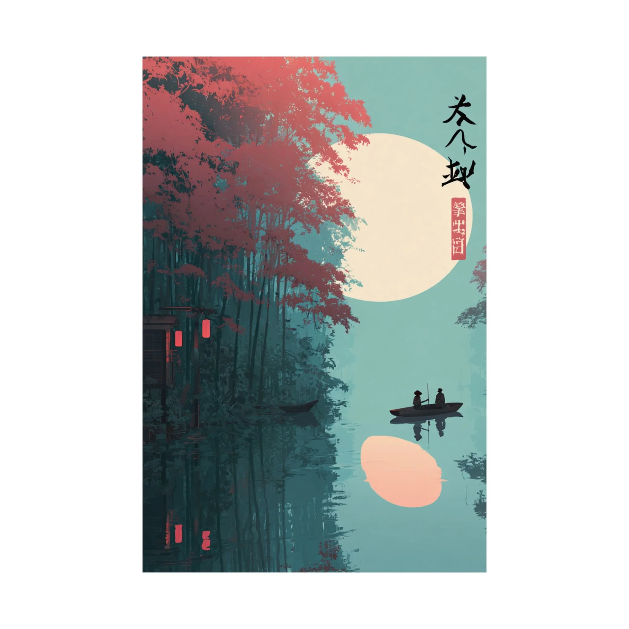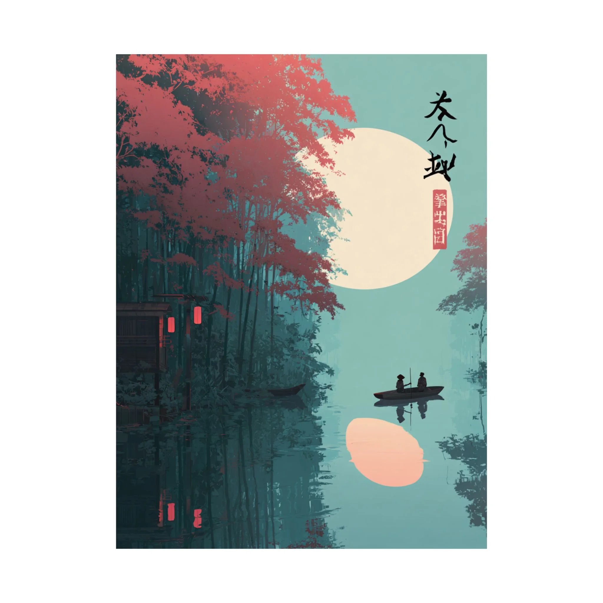 A quiet river at dusk, captured in soft matte tones. This vertical poster pairs museum-grade archival paper with giclée printing to render deep teal waters, coral foliage, and a warm moon glow with lasting vibrancy. Hung beside a reading nook or above a low shelf, it brings a calm, contemplative mood—like drifting in a small boat under lantern light. The composition’s minimalist silhouettes and East Asian-inspired marks create a meditative focal point for rooms that favor layered textures and subtle storytelling.