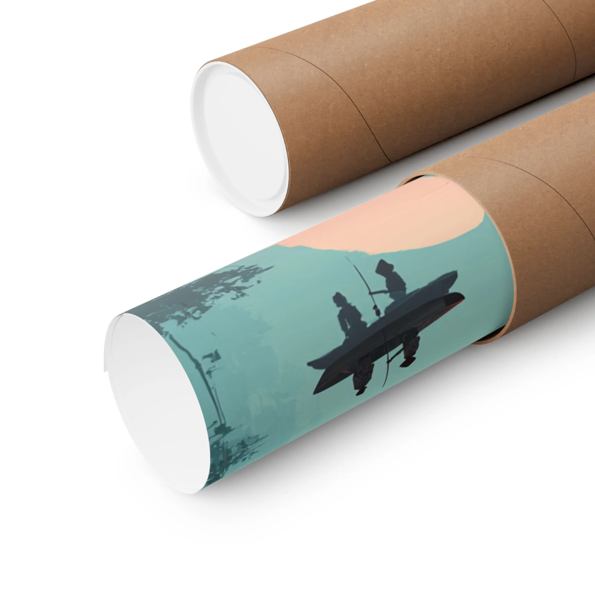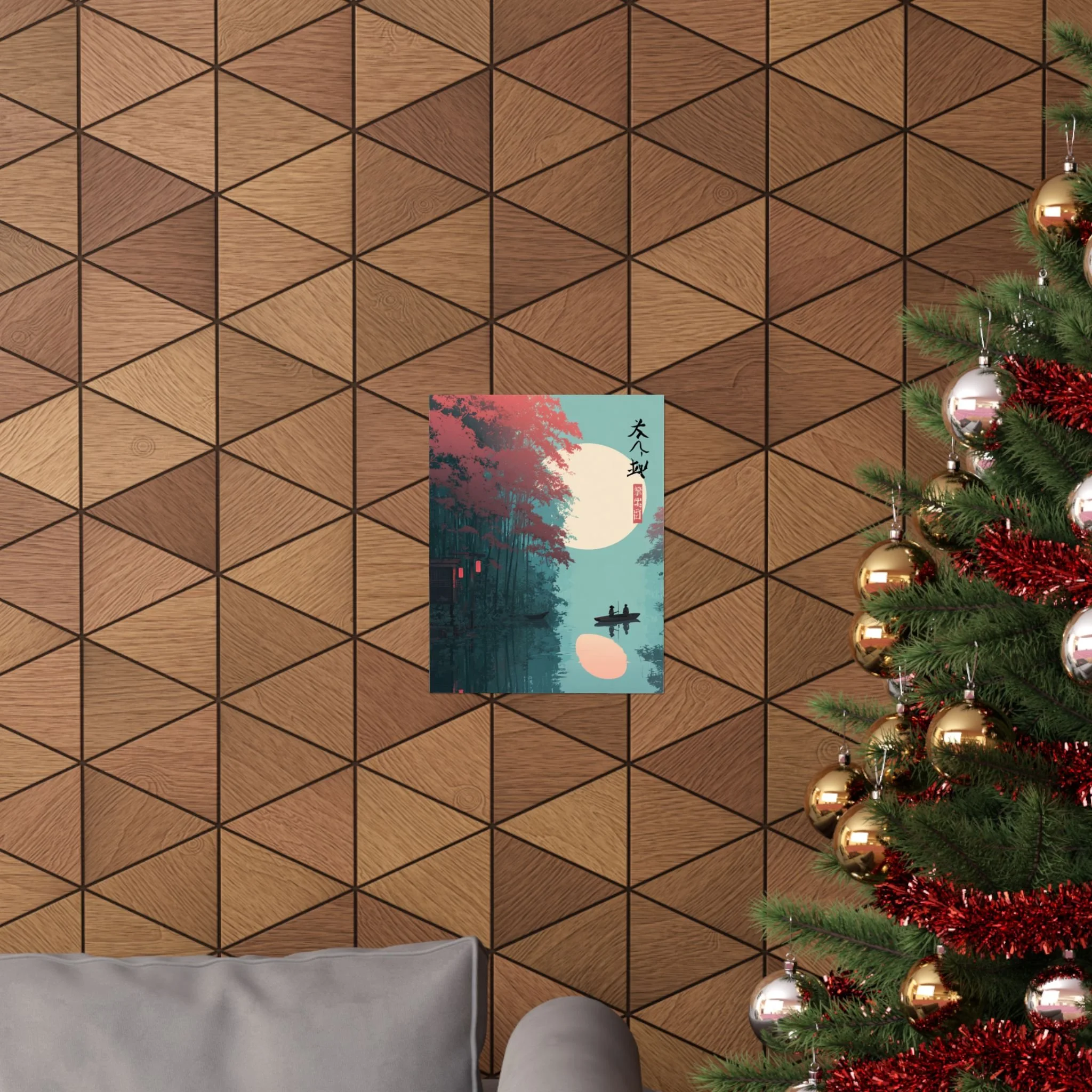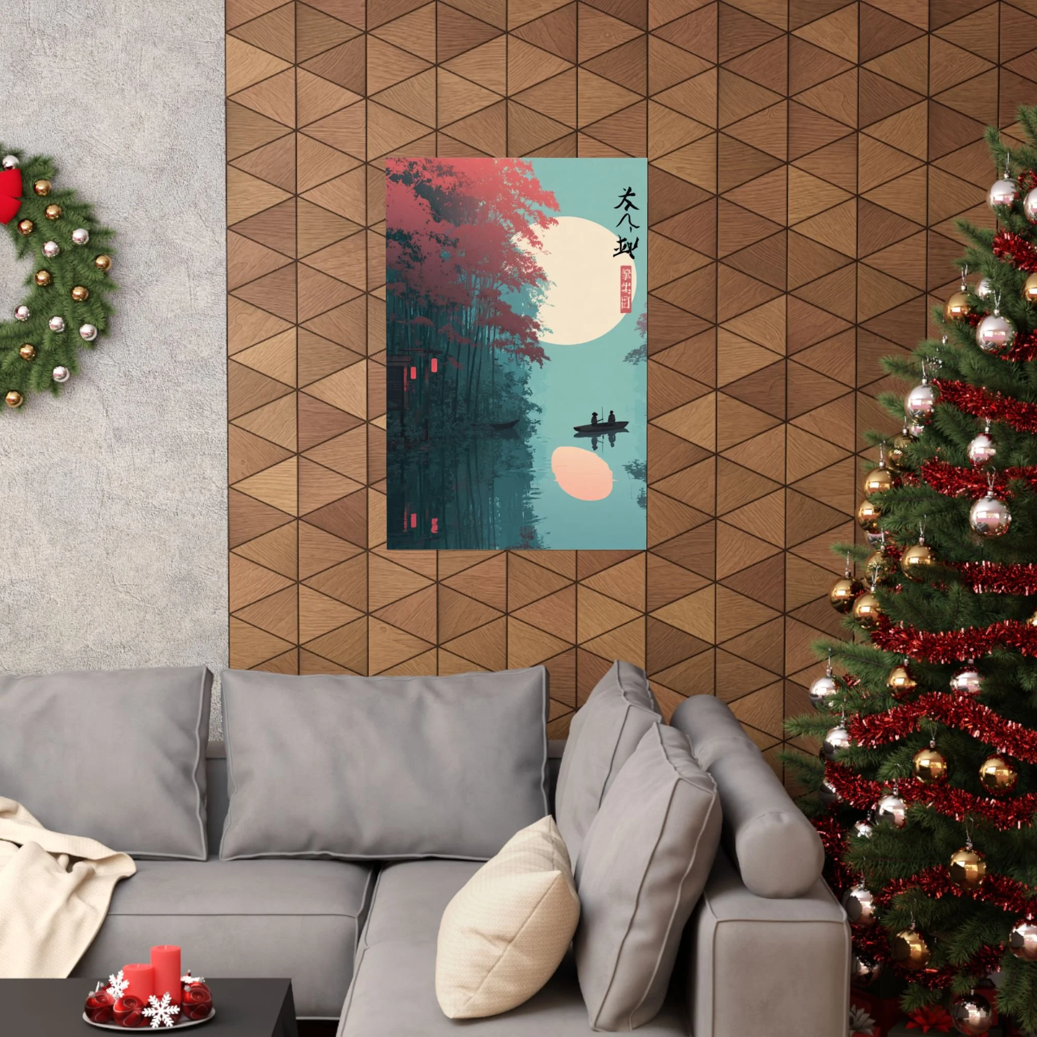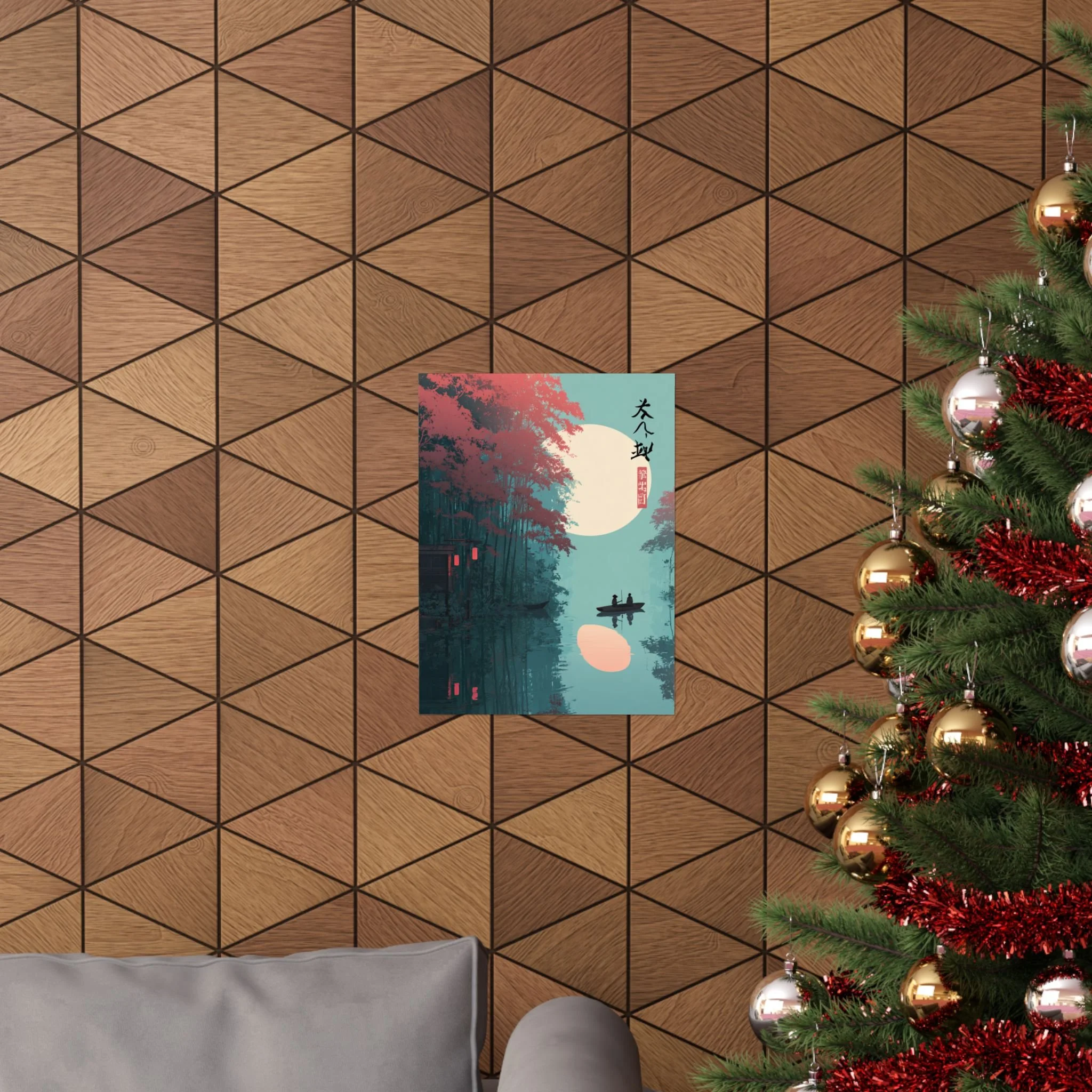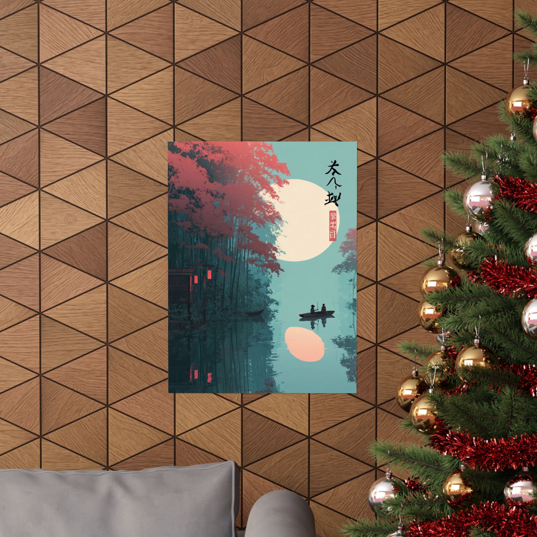 A quiet river at dusk, captured in soft matte tones. This vertical poster pairs museum-grade archival paper with giclée printing to render deep teal waters, coral foliage, and a warm moon glow with lasting vibrancy. Hung beside a reading nook or above a low shelf, it brings a calm, contemplative mood—like drifting in a small boat under lantern light. The composition’s minimalist silhouettes and East Asian-inspired marks create a meditative focal point for rooms that favor layered textures and subtle storytelling.